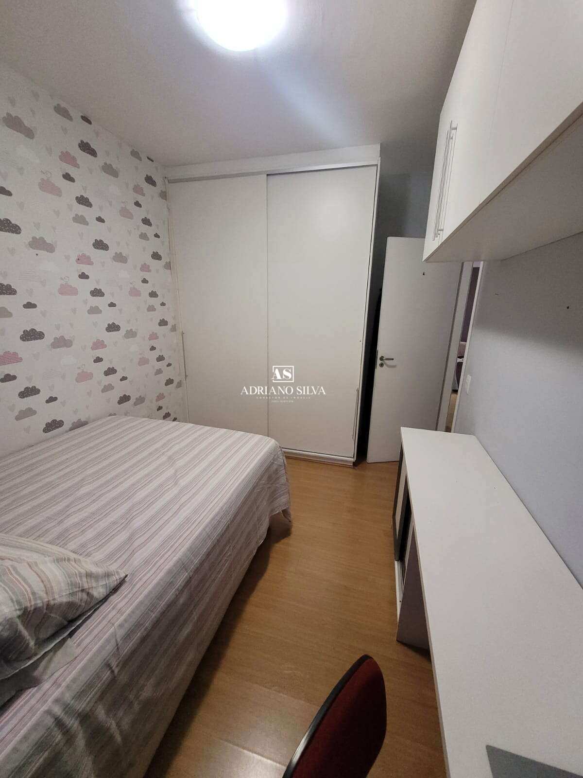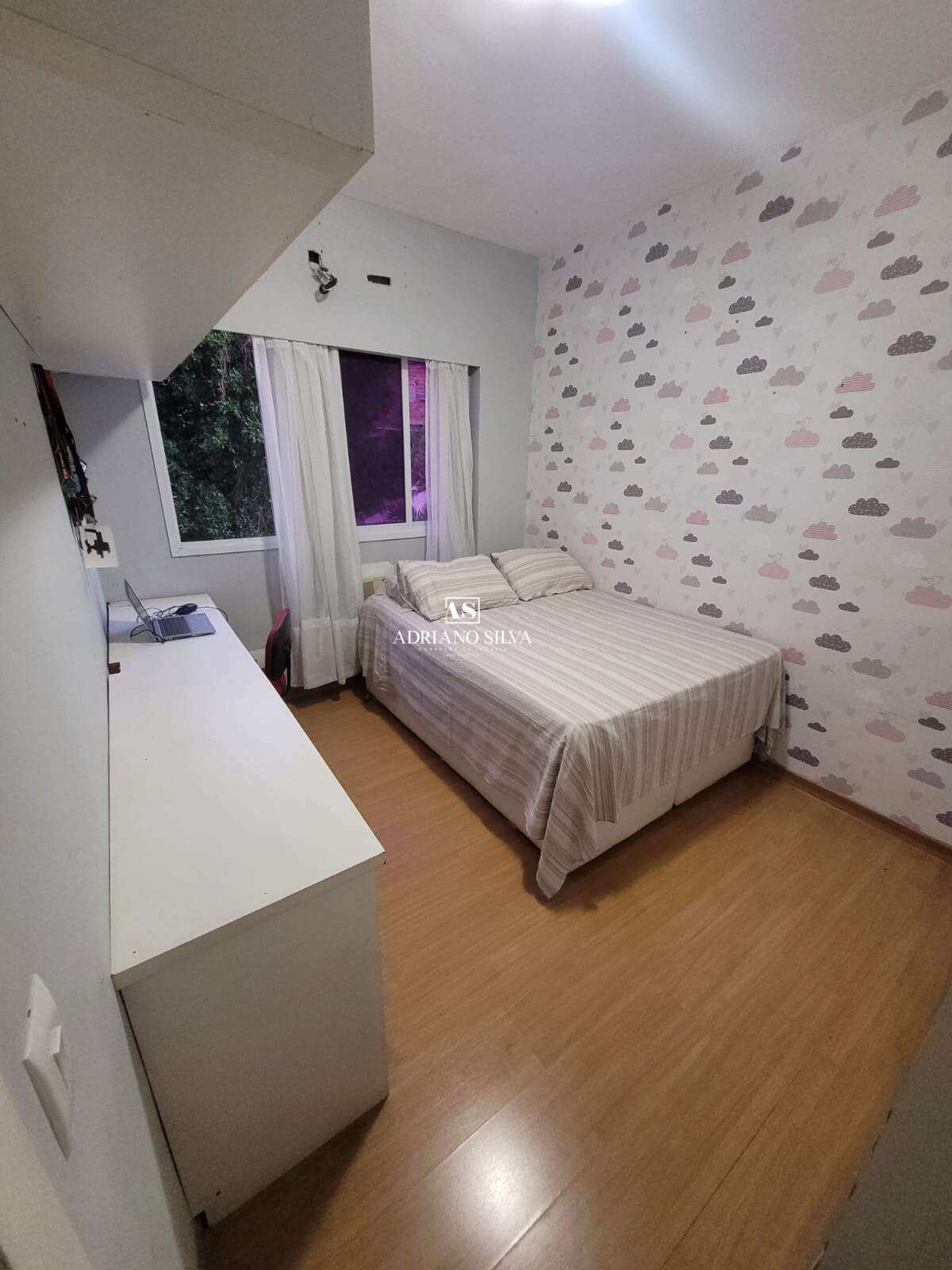 Quarto adicional: armários planejados, bancada de estudos/trabalho, ar-condicionado e tubulação pronta para Split, vista para área verde e piscina.