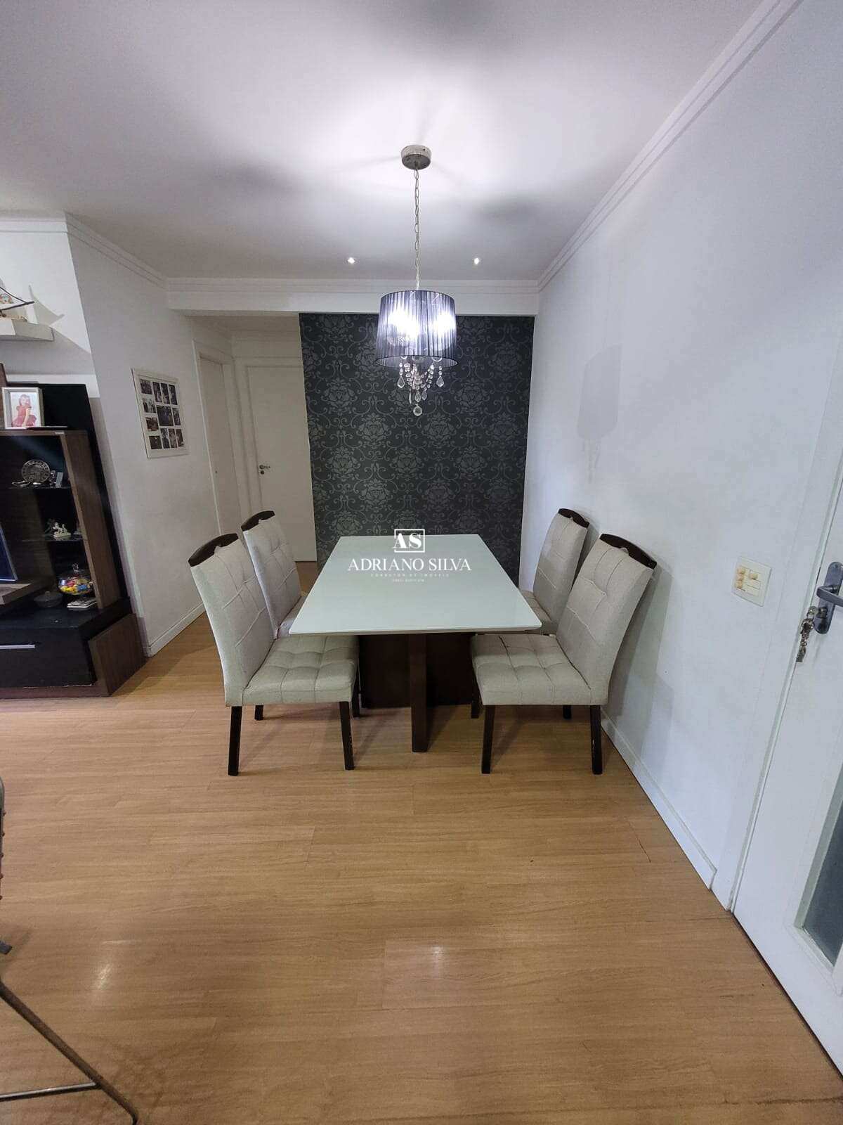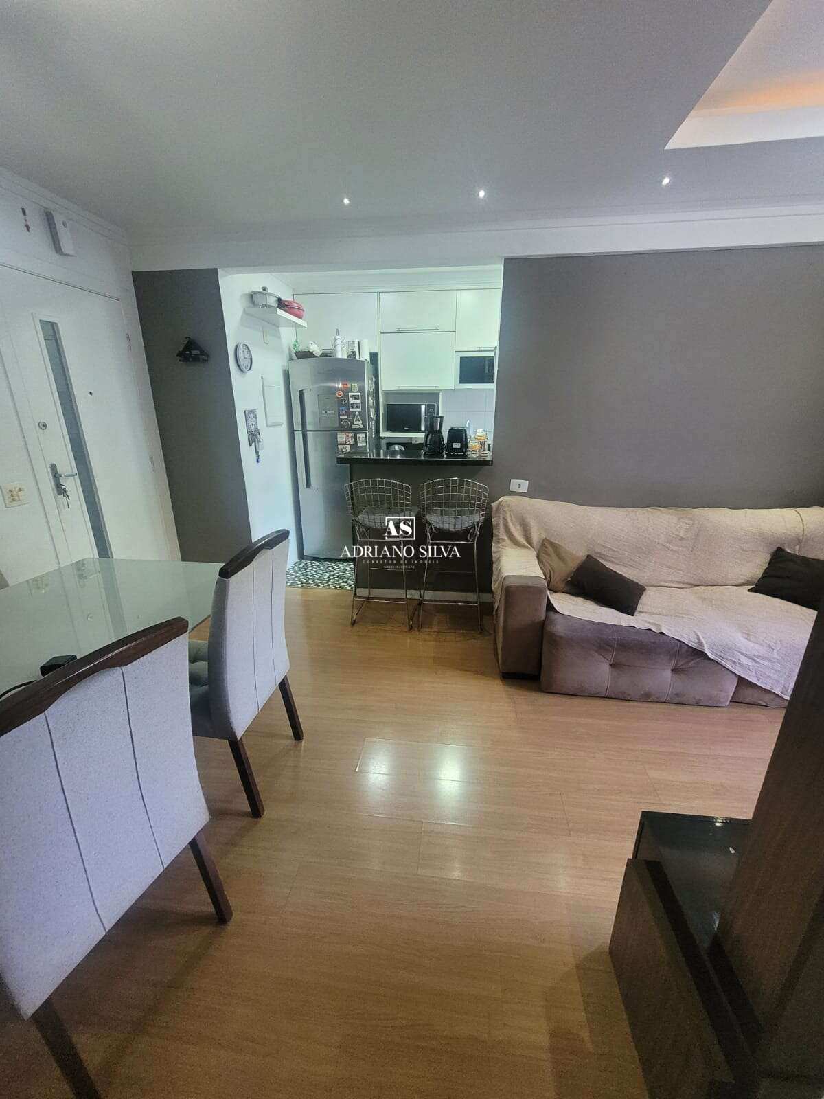 Sala ampla: teto rebaixado em gesso, luminárias dimerizáveis, papel de parede e acabamento sofisticado.